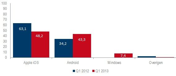 Wereldwijd zijn er in het eerste kwartaal van dit jaar 40,6 miljoen tablets verscheept, een stijging van 118 procent op jaarbasis. Daarvan draaide 48 procent op Apple’s iOS, gevolgd door Android met een marktaandeel van 43 procent. Een jaar geleden bezat Android nog een marktaandeel van 34 procent. Windows bleef in Q1 2013 steken op een wereldwijd aandeel van 7,5 procent, zo blijkt uit onderzoek van Strategy Analytics.