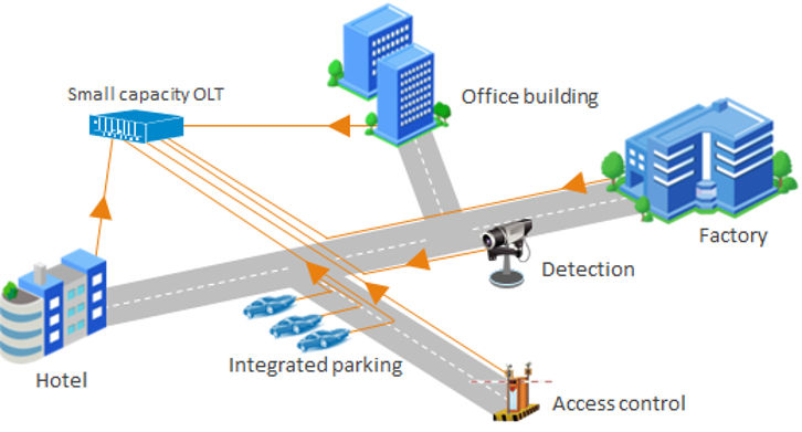 In these scenarios, the operators are sensitive to cost and have lower bandwidth demand; therefore, deploying small capacity OLTs can easily reduce initial investments and satisfy the operators’ requirements for rapid deployment and flexible scalability. - Smart industrial park and commercial building coverage