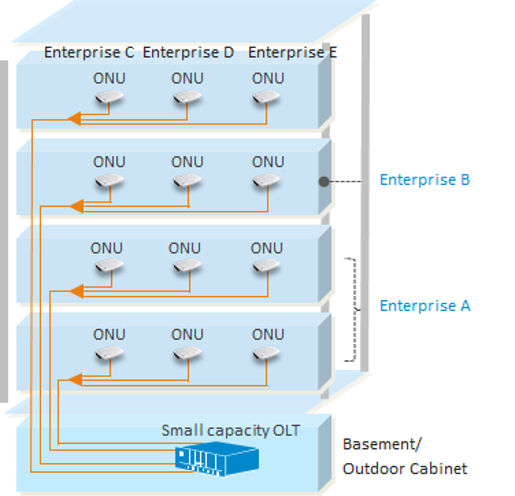 In this scenario, small capacity OLTs can be deployed in the basement of a commercial building: