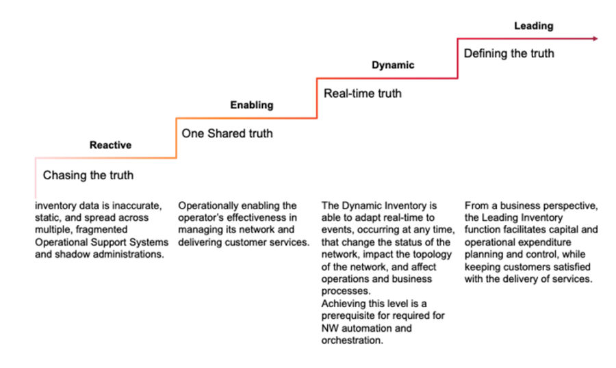 De volwassenheidsniveaus in dit model omvatten: Reactive, Enabling, Dynamic en Leading. Op het ‘Reactive’ niveau zijn de inventory gegevens onnauwkeurig, statisch en verspreid over meerdere, gefragmenteerde operationele systemen en schaduwadministraties. Op het ‘Enabling’ niveau zijn de inventarisgegevens geconsolideerd. De exploitant kan hiermee zijn netwerk doeltreffend beheren en zijn klanten diensten verlenen. Op het niveau ‘Dynamic’ zijn de administratieve systemen in staat zich in real time aan te passen aan gebeurtenissen die van invloed zijn op het netwerk, de netwerkcomponenten en op de operaties en bedrijfsprocessen. Dit niveau is een voorwaarde voor succesvolle netwerkautomatisering. Op het vierde en laatste volwassenheidsniveau, ‘Leading’, vergemakkelijkt network inventory de planning van en controle op investeringen en operationele uitgaven. Hierdoor blijven klanten, nu én in de toekomst, tevreden over de telecomdiensten zoals ze die verwachten – stabiel, steeds sneller en beschikbaar waar en wanneer men wilt.