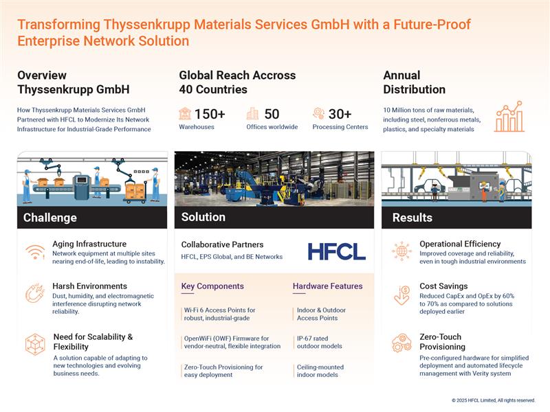 To address the challenges of aging network infrastructure, Thyssenkrupp Materials Services GmbH implemented HFCL's innovative Open Networking solution with Wi-Fi 6 Access Points, creating a robust, flexible network to support digital transformation initiatives in harsh industrial environments.
